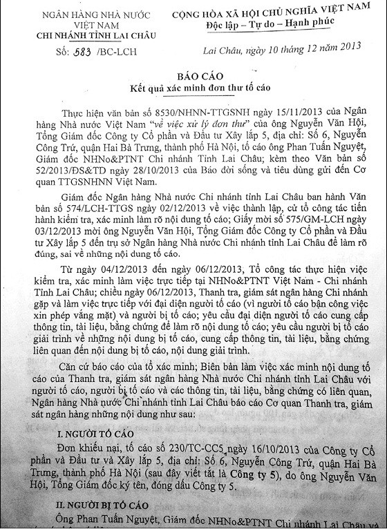 Liên quan đến những nội dung tố cáo của ông Hội, Ngân hàng Nhà nước Việt Nam, chi nhánh tỉnh Lai Châu (Ngân hàng NNVN tỉnh Lai Châu) đã vào cuộc xác minh và có văn bản báo cáo kết quả.