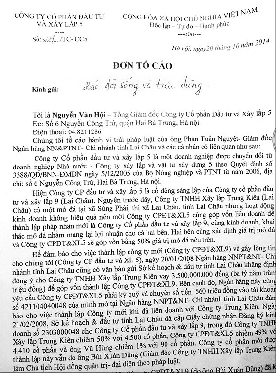 Vừa qua, Báo Đời sống & Tiêu dùng nhận được đơn của ông Nguyễn Văn Hội, Tổng Giám đốc Công ty Cổ phần đầu tư và Xây lắp 5 (Công ty 5, trụ sở tại quận Hai Bà Trưng, TP Hà Nội) phản ánh một số vấn liên qaun đến ông Phan Tuấn Nguyệt, Giám đốc Chi nhánh Ngân hàng Nông nghiệp và Phát triển nông thôn Việt Nam (NHNo&PTNT) tại Lai Châu (Agribank Lai Châu). Mặc dù đã nhận được trả lời ông Hội cho rằng, việc giải quyết của cơ quan chức năng đó không hoàn toàn đúng bản chất sự việc.