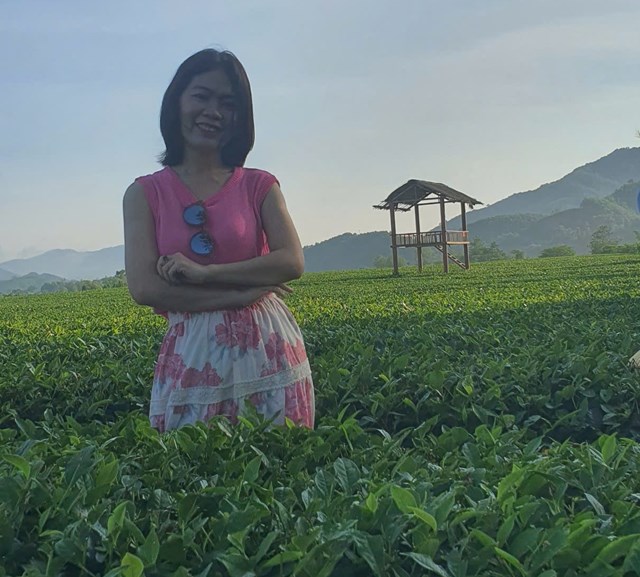 Chị Nhung một du khách đến từ Huế phải trầm trồ trước vẻ đẹp đồi chè nơi đây