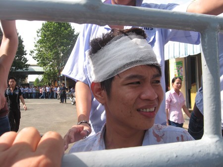 Theo nạn nhân - anh Nguyễn Minh Nhã, SN 1986, quê tỉnh Tiền Giang: Trong lúc cùng hàng trăm công nhân khác tập trung để đòi công ty tăng lương, anh đã bị 1 bảo vệ dùng ba trắc đập mạnh vào đầu.