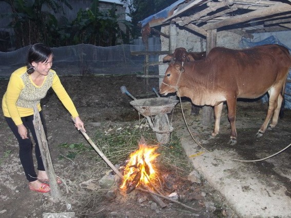 Đốt lửa sưởi ấm cho bò. (Ảnh: Hồ Cầu/TTXVN)