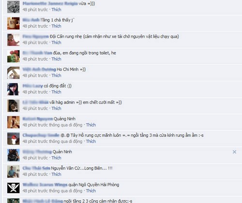 Trên facebook nhiều người đã chia sẻ những dòng status về động đất như: “Hình như vừa có động đất?”; “Sợ quá động đất cả nhà ạ”; “Chuyện lạ, Hà Nội có động đất”…