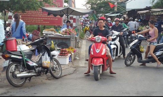 Người và xe lưu thông, mua bán hàng hoá trên đường Phạm Văn Đồng đã khiến nơi đây trở nên hỗn loạn.