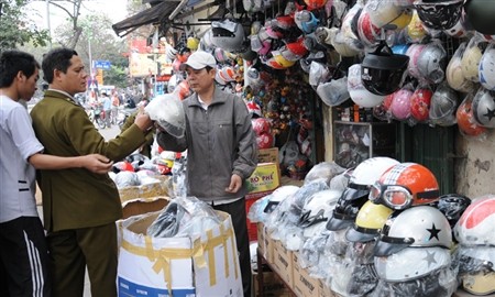 Lực lượng quản lý thị trường kiểm tra các cơ sở kinh doanh mũ bảo hiểm trên phố Huế (quận Hai Bà Trưng, Hà Nội) ngày 8-3. Ảnh: Tuấn Nguyễn.