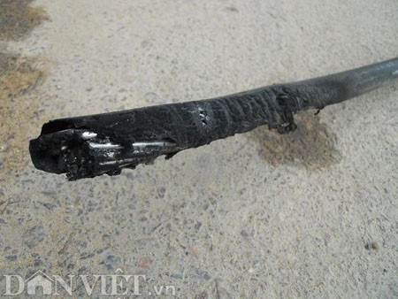Sau khi bị nổ dây điện rơi xuống đường tiếp tục cháy đun chảy nhôm, vỏ nhựa lẫn nhựa đường.