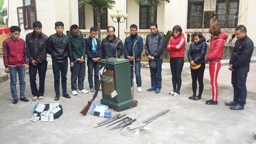 Tại đây công an thu giữ tang vật gồm gần 2 tỷ đồng tiền mặt, một khẩu súng cùng 18 viên đạn, nhiều máy fax, hàng trăm bảng lô, đề, cùng mã tấu, đao kiếm các loại.