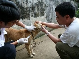 Tiêm vắcxin bệnh dại cho chó. (Ảnh: Xuân Trường/TTXVN)