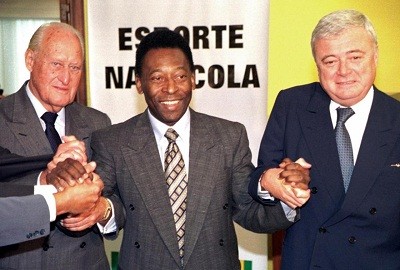 Từ trái qua là Joao Havelange, Vua bóng đá Pele cùng Ricardo Teixeira, những nhân vật từng là quyền lực nhất của bóng đá Brazil (Nguồn: AP)