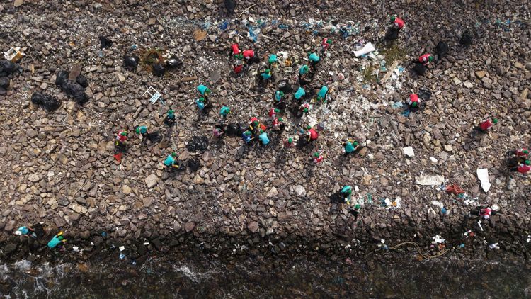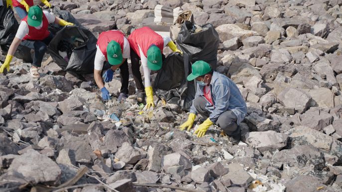 Cán bộ nhân viên Vingroup chung tay dọn rác tại khu vực ghềnh đá giữa Bến tàu khu du lịch Vĩnh Trường và Khu đô thị An Viên