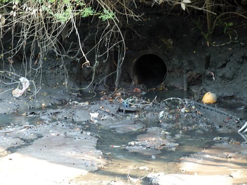 Ống cống từ Công ty Viguato liên tục rỉ nước đen ra kênh - Ảnh: Hải Nam