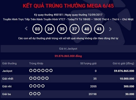 Tại kỳ quay số mở thưởng mới đây nhất (thứ 181, ngày 15/9), Công ty Xổ số Điện toán Việt Nam (Vietlott) cho biết giá trị giải jackpot đã lên đến gần 60 tỷ đồng nhưng vẫn chưa có chủ nhân. Dãy số trúng giải này là 03 - 24 - 35 - 37 - 40 - 43.