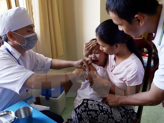 Tiêm vắcxin phòng viêm não Nhật Bản cho trẻ. (Ảnh: Duy Khương/TTXVN)
