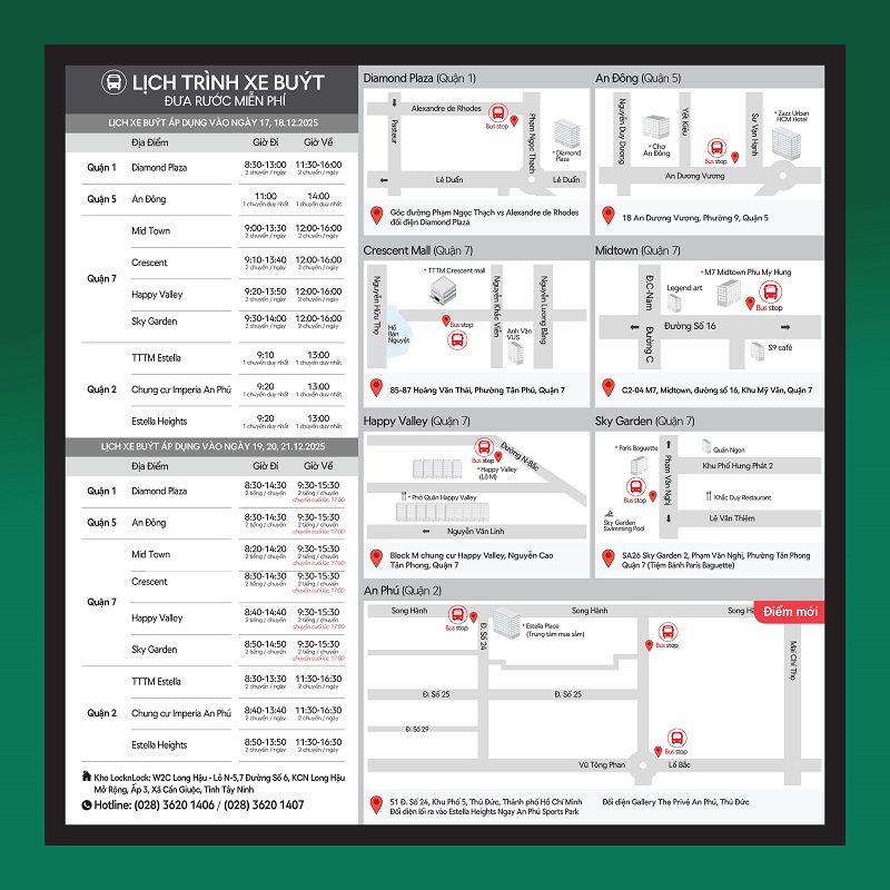 Chương trình năm nay còn tích hợp hàng loạt dịch vụ tiện ích song song với hoạt động mua sắm, như hỗ trợ xe buýt đưa đón tại các điểm trạm, tư vấn mua hàng tại quầy, chính sách bảo hành ưu việt, giúp hành trình mua sắm trở nên thuận tiện, trọn vẹn và đầy hứng khởi. LocknLock bố trí dịch vụ xe bus đưa đón tại các điểm trạm.