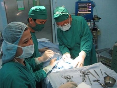 GS.TS. Hiramoto Michiaki cùng các đồng nghiệp phẫu thuật miễn phí cho các em nhỏ. Ảnh Đ.H