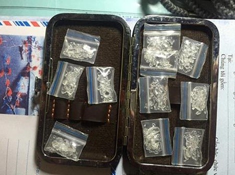 Tiến hành kiểm tra trên người đối tượng, Cảnh sát phát hiện trong túi quần có 11 túi nhỏ màu trắng, kích thước 2x3cm nghi là ma tuý đá đựng trong 1 ví da.