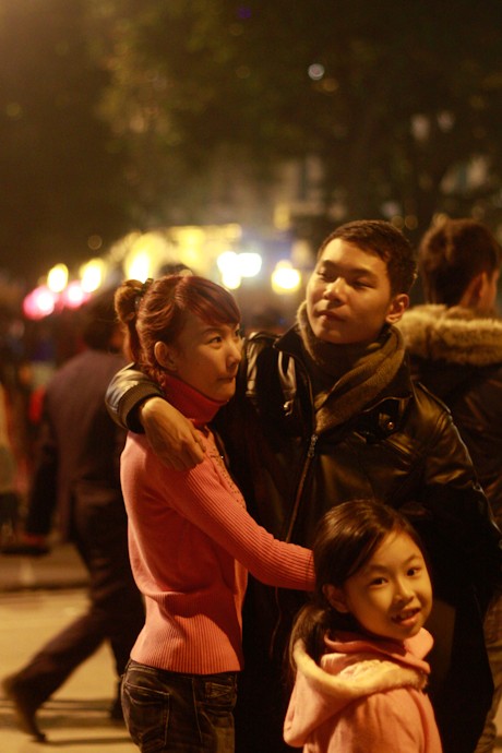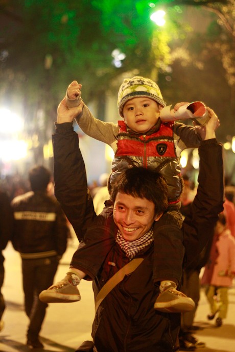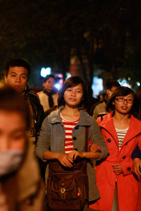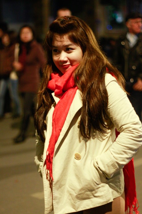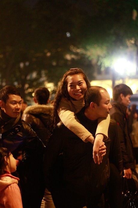 Khác với không khí đón tết của các học sinh, sinh viên tại KTX Mễ Trì, nhiều bạn trẻ ở Hà Nội đổ ra đường để đi chơi tất niên. Khu vực Hồ Gươm với điểm hẹn Phố Hoa đang diễn ra, khu vực Nhà thờ lớn với nhiều chương trình văn nghệ hấp dẫn vẫn là những địa điểm được nhiều bạn trẻ lựa chọn. Ngay từ rất sớm, các tuyến đường đổ về phía Hồ Gươm và Nhà hát lớn như Phố Huế, Hàng Bông...dòng người, xe cộ đông đúc, nườm nượp. Nhiều tuyến phố bị tắc, nhưng không phải vì thế mà các bạn trẻ lỡ hẹn với những chương trình âm nhạc và những tác phẩm kết hoa tuyệt đẹp trong ánh áng lung linh tại Hồ Gươm trong đêm giao thừa. PV Dantin đã ghi lại được những hình đón giao thừa của các bạn trẻ tại đây: