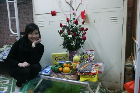 một lọ hoa tươi, hoa quả, và bánh chưng...được đặt trong phòng khiến nơi đây tràn ngập không khí đón tết (Ảnh: Thành Hưng)