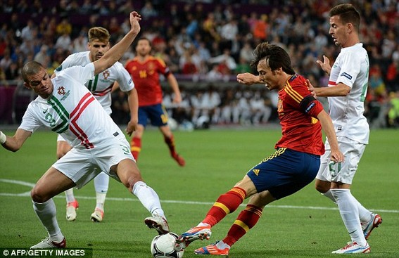 Trước lối chơi bắt người từ xa của Bồ Đào Nha, Tây Ban Nha đã phần nào gặp khó khăn trong việc triển khai thế trận. Phút 29, Negredo có bóng trong vòng cấm rồi kiến tạo cơ hội cho Iniesta ở một tư thế khá trống trải nhưng cú dứt điểm của anh lại đi vọt xà ngang. Ngay sau đó, Pereira cướp được bóng trong chân của Alba rồi chuyền bóng cho Ronaldo thực hiện pha sút xa đi sạt cột dọc.