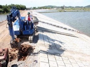 Một đoạn đê kè đang được thi công. Ảnh: Đình Huệ/TTXVN