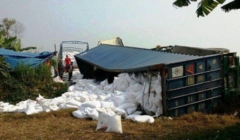 Rạng sáng ngày 19/1, một chiếc xe container chạy từ Móng Cái, Quảng Ninh về đến phận bàn xã Thanh Xuân, huyện Sóc Sơn, Hà Nội bất ngờ bị lật khiến hàng trăm tấn gạo đổ xuống đường.