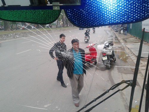 Kính chắn gió của xe buýt tuyến 22 (BKS 30T-5009) bị đập nứt vỡ