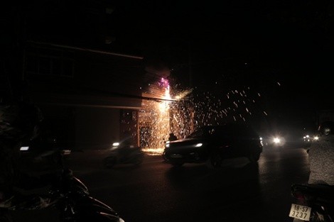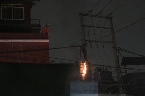 Trụ điện cháy gây ra những tiếng nổ lớn. Sự việc xảy ra ngay ven đường đúng giờ tan tầm khiến giao thông khó khăn.