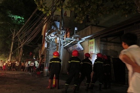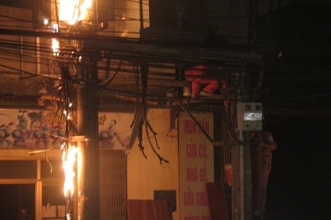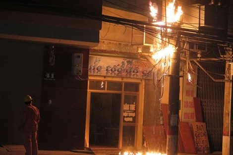 Cùng với sự trợ giúp của người dân xung quanh, nhân viên Điện lực phải dùng nước để tiếp tục dập đám cháy