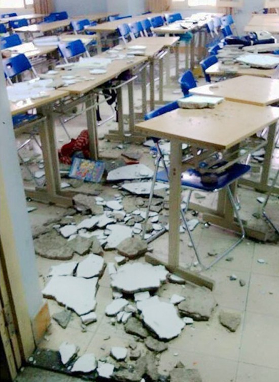 Trong khi cả lớp đang ngồi học thì bất ngờ một mảng vữa trần nhà rơi xuống, trúng đầu một sinh viên khiến em này phải nhập viện cấp cứu.