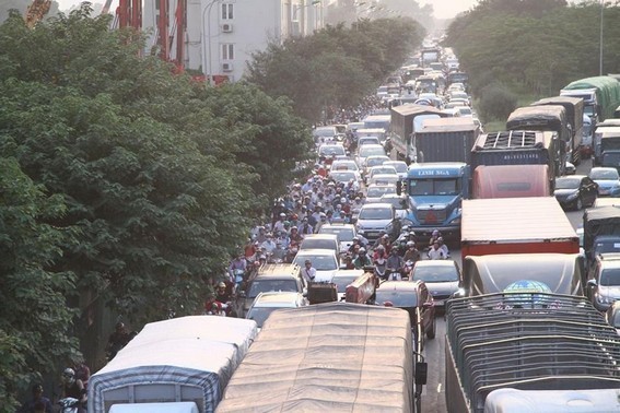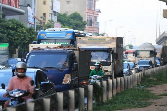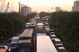 Đại lộ Thăng Long, hướng về đường vành đai 3 tắc vài cây số, theo phản ảnh của lái xe tình trạng trên kéo dài đã gần một tiếng đồng hồ.
