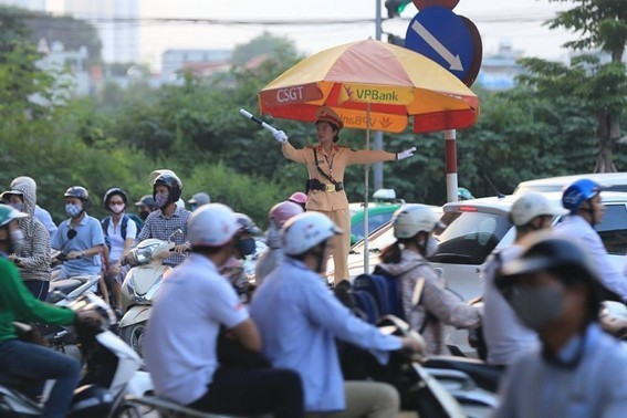Tại nút giao trước bến xe Nước Ngầm, lực lượng CSGT đã có mặt từ sớm phân làn giao thông.