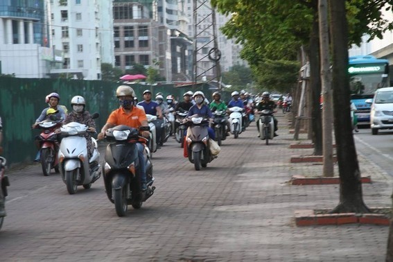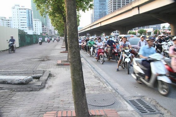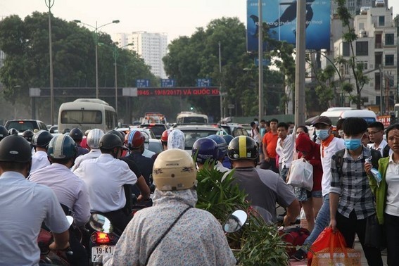 Do kỳ nghỉ lễ 2/9 kéo dài 3 ngày nên nhiều người tranh thủ về quê, lưu lượng tham gia giao thông tăng đột biến. Đường Phạm Hùng, giao thông ùn tắc, nhiều người phải leo lên vỉa hè để đi.