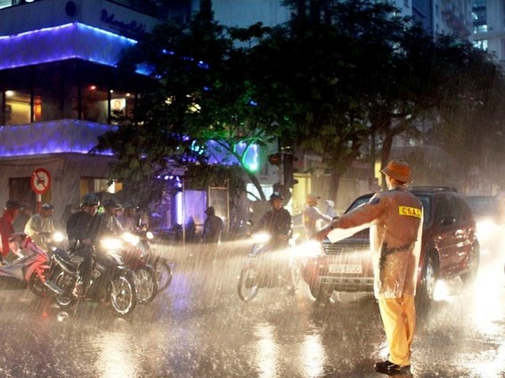 Cảnh sát giao thông phân luồng, đảm bảo an toàn giao thông khi trời tối mưa. (Ảnh: Dương Giang/TTXVN)
