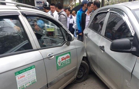 Theo các nhân chứng có mặt tại hiện trường cho biết, vào thời điểm trên chiếc taxi mang BKS 30A-299.76 hãng Sông Hồng lưu thông theo hướng Đào Duy Anh đi Phạm Ngọc Thạch bất ngờ đâm trúng chiếc xe máy mang BKS 29Y8-0270 đi cùng chiều và 3 chiếc xe ô tô khác. Cú va chạm mạnh khiến chiếc xe máy văng ra xa khoảng 10 mét. Người điều khiển xe máy bị thương được đưa đi bệnh viện cấp cứu.