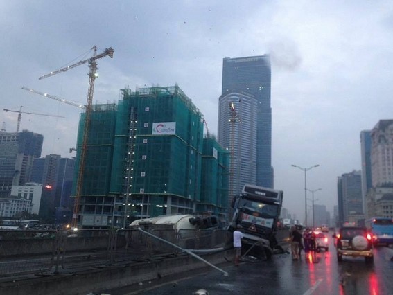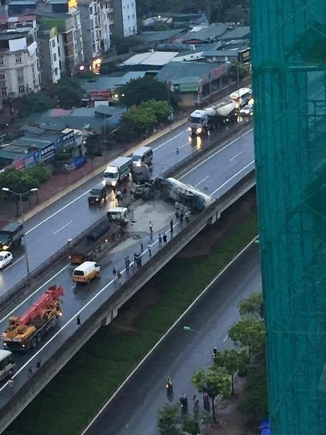 “Chiếc xe bồn đang lưu thông theo hướng từ Big C đi cầu Nam Thăng Long, khi đến gần ngã tư Phạm Hùng – Dương Đình Nghệ đã thiếu chú ý quan sát và đâm vào đuôi xe tải đang đỗ trái chiều trên đường cao tốc. Hậu quả, chiếc xe bồn bị lật ngang đường, rất may lái xe không bị thương”, ông Thành nói.