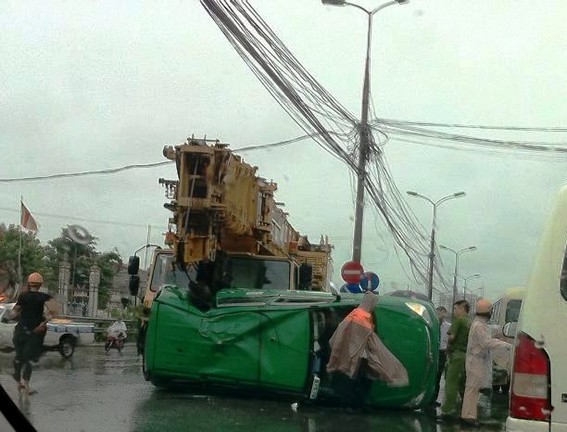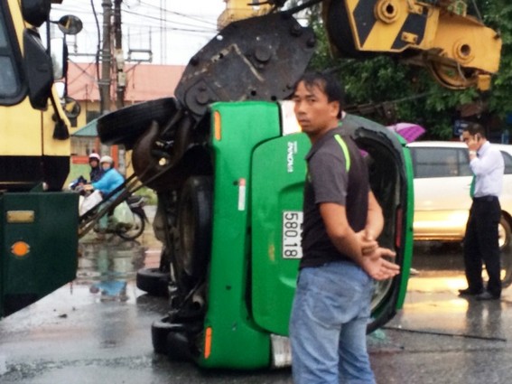 Cú va chạm rất mạnh khiến chiếc xe taxi bị lật nghiêng giữa đường, chiếc móc của xe cẩu còn “ngoạm” một miếng vào chính giữa thân chiếc xe taxi làm chiếc e này bị hư hỏng nặng.
