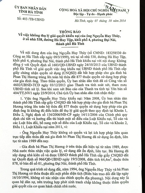 Ngày 18/7/2013, tức gần 2 năm sau khi ông Thủy gửi đơn, UBND TP.Hà Tĩnh đã ra Thông báo 62 thụ lý giải quyết vụ việc và đến ngày 24/10/2013 mới ra Quyết định 1683 giải quyết khiếu nại lần đầu.
