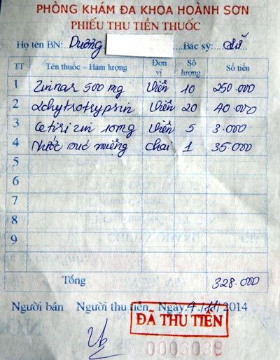 Hóa đơn thu tiền bán thuốc tại phòng khám đa khoa Hoành Sơn.