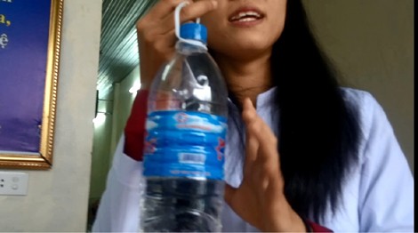 Nhân viên phòng khám đưa chai nước súc miệng cho phóng viên (ảnh cắt từ video clip).