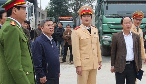 Chủ tịch UBND tỉnh Hà Tĩnh Võ Kim Cự (thứ 2 từ trái qua) kiểm tra hoạt động của xe quá tải tại huyện Kỳ Anh