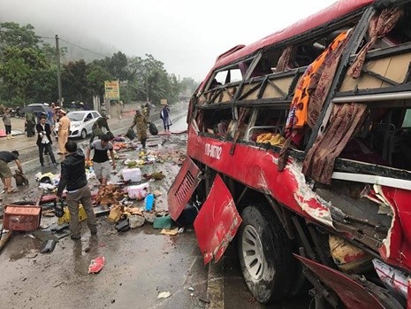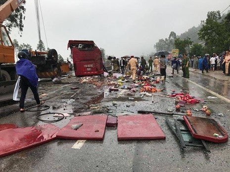 Tại hiện trường, chiếc xe khách bị bẹp dúm mảnh vỡ bắt ra tung tóe và hàng chục hành khách bị thương nằm rải rác trên đường.