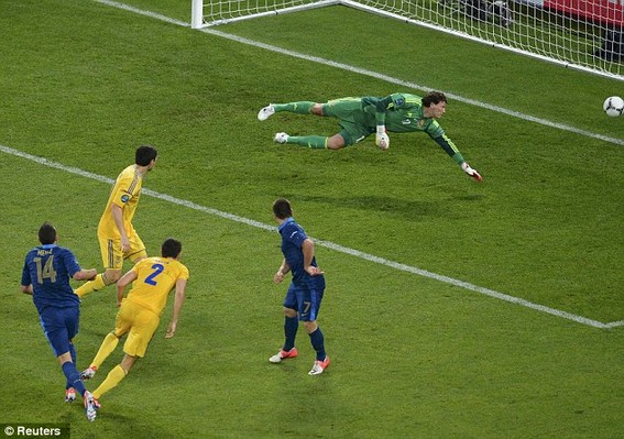 Cuối hiệp một, Ukraine đã siết chặt đội hình và tạo ra thế trận cân bằng hơn. Phút 34, Selin thực hiện đường chuyền dài từ bên phần sân nhà cho Shevchenko phá bẫy việt vị rồi tung ra cú đát quyết đoán buộc Hugo Lloris phải đẩy bónggiải nguy. Ít phút sau, Nasri treo bóng chuẩn xác từ quả đá phạt chếch sang cánh trái để Mexes bật cao đánh đầu lái bóng hiểm hóc khiến thủ môn Pyatov phải bay người hết cỡ để cứu thua.