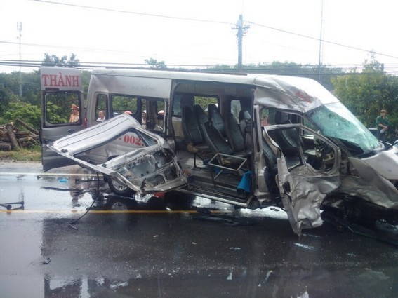 Hiện trường vụ hai xe đối đầu khiến 14 người thương vong.