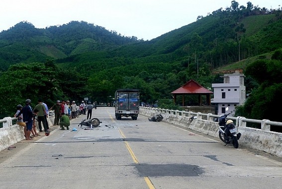 Hậu quả hai xe máy biến dạng, 3 thanh niên là Khéo, Sáng, Vị tử vong trên đường đi cấp cứu, riêng Chương bị thương nặng đang được điều trị.