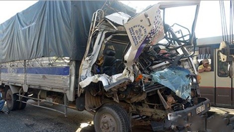 Cú tông khiến cabin xe 10 tấn bẹp dúm, tài xế và phụ xe kẹt cứng bên trong. Người dân phải dùng xà beng nạy cửa đưa hai người đi cấp cứu nhưng phụ xe đã tử vong, tài xế chỉ bị trầy xước nhẹ.