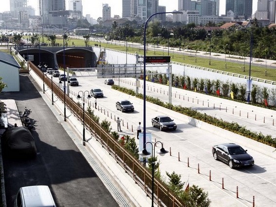 Các phương tiện lưu thông qua hầm Thủ Thiêm phía quận 2. (Ảnh: Hoàng Hải/TTXVN)