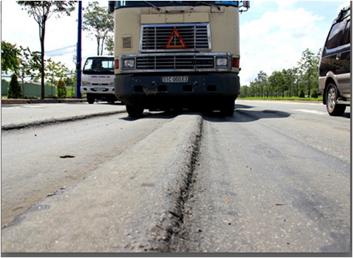 Hiện tượng hằn lún vệt bánh xe tại đường Mai Chí Thọ, TP HCM, gây nguy hiểm cho các phương tiện tham gia giao thông.