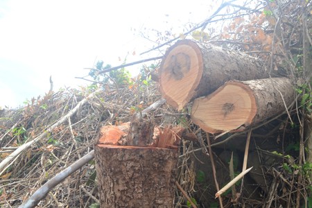 Những cây lâu năm có đường kính từ 40 - 50cm ở rừng phòng hộ Đông Tiễn bị chặt hạ nằm la liệt.
