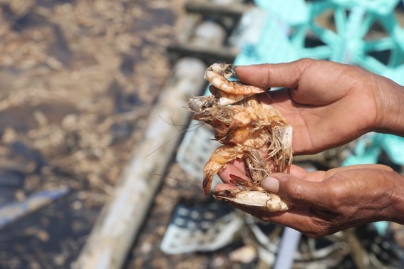 Tôm trong thời kỳ gần thu hoạch chết hàng loạt, khiến người dân mất trắng. Ảnh Hoài Nam