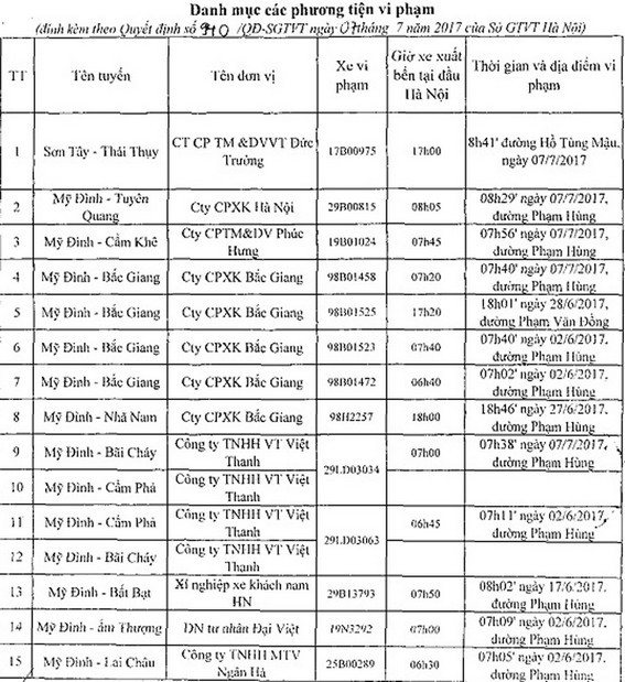 Liên quan đến tình trạng này, Sở GTVT Hà Nội đã tiến hành kiểm tra hoạt động vận tải tại khu vực bến xe Mỹ Đình và các tuyến đường Phạm Văn Đồng, Phạm Hùng, Hồ Tùng Mậu... và phát hiện hàng loạt xe khách vi phạm.
