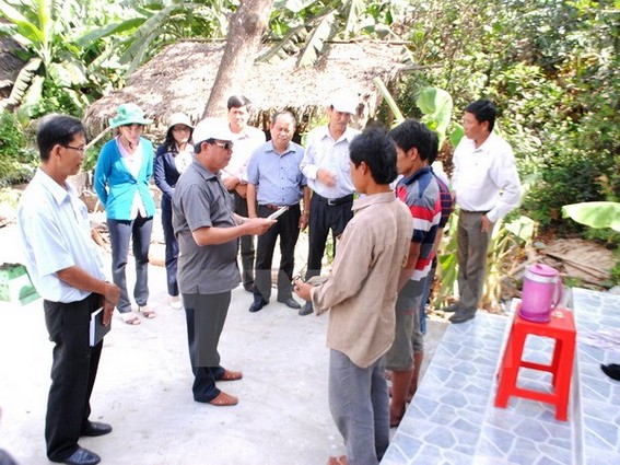 Lãnh đạo tỉnh Hậu Giang thăm hỏi, động viên, hỗ trợ tiền cho các hộ bị thiệt hại trong vụ hỏa hoạn. (Ảnh: Huỳnh Sử/TTXVN)